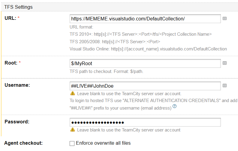 The only out-of-the-ordinary thing that I ever did was TeamCity->VSO which requires you to generate the basic auth creds (https://www.visualstudio.com/en-us/integrate/get-started/auth/overview) for an account then put them into the TeamCity VCS root. the odd thing about this is that when connecting to TFS (On premise) the username format is DOMAIN\Username, but with VSO its ##LIVE##\Username