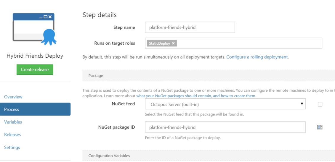 - Pick up the nuget package with an Octopus Server and store variables for dev/test/prod in octopus